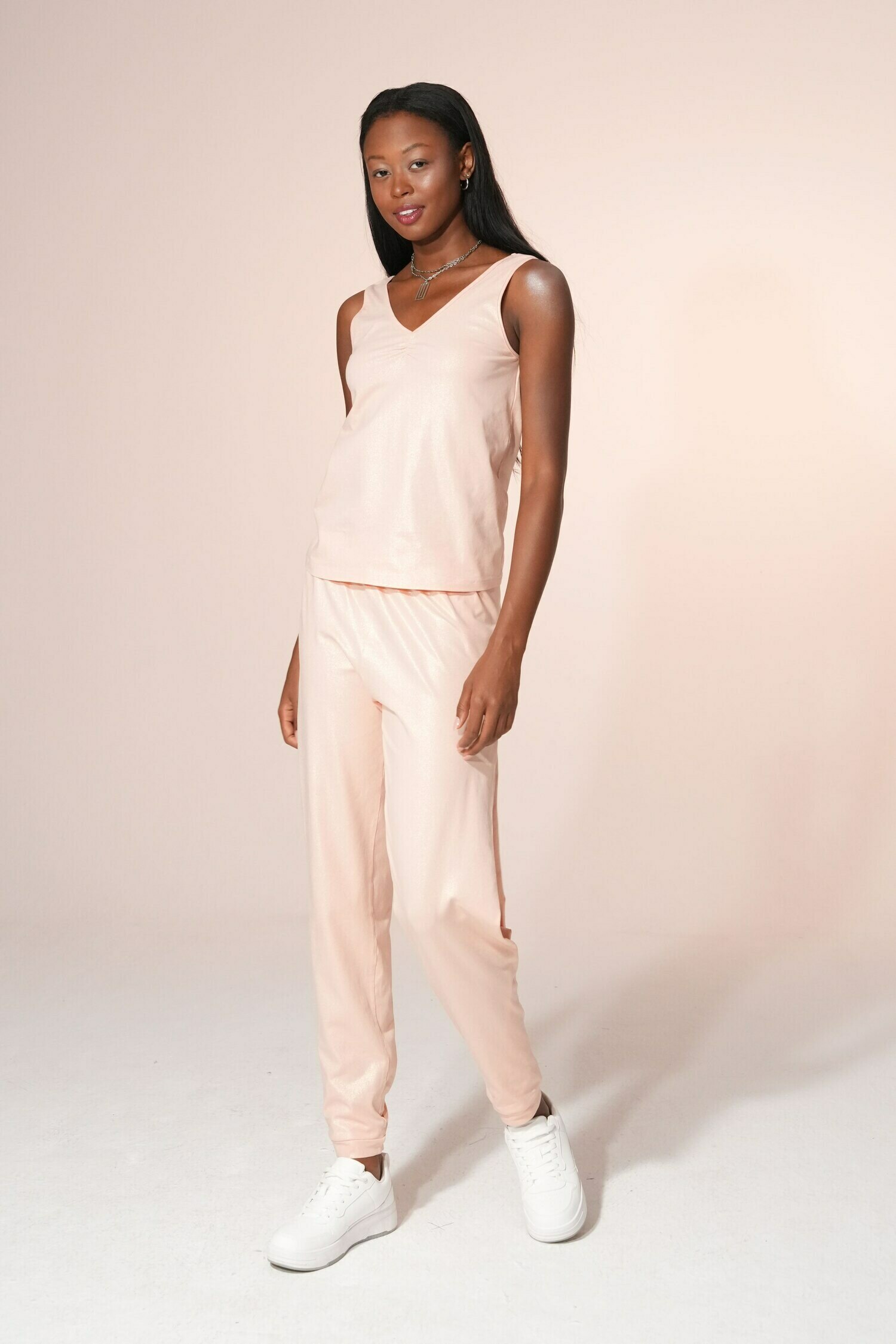 Rahatlıkla özgüvenin buluştuğu bu ışıltılı takım, günlük konforu modern bir şıklığa dönüştürüyor. Aynı parlak kumaştan tasarlanan kolsuz üst ve yandan yırtmaçlı pantolon, ister evde ister dışarıda, her adımda seninle birlikte akıyor.