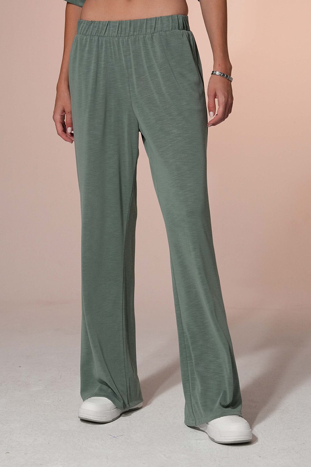 Hareketin zarafete dönüştüğü bu pantolon, sade ama etkileyici bir rahatlık sunuyor. Her adımda dökümlü bir akış hissiyle, evde yalınayak da olsan şehirde yürürken de zamansız bir şıklık yaratıyor.